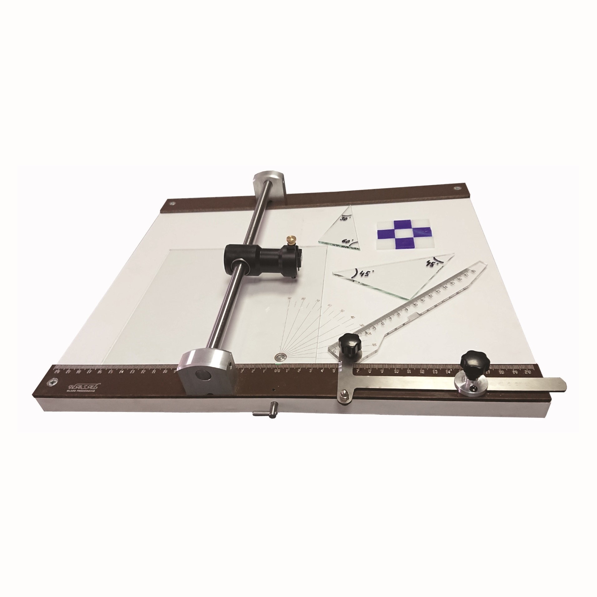 Angle and support ruler with divisions. Breaking and cut opening button, Cuts glass panes and stripes with lineer bearing bridge head easily and quickly. Adjustable  head for 2-6 mm glass. Calibrated bar to adjust cutting head distance. VISCOR HM tungsten carbide 135º cutting wheel, Ø5.0×1.0xØ1,30 mm.