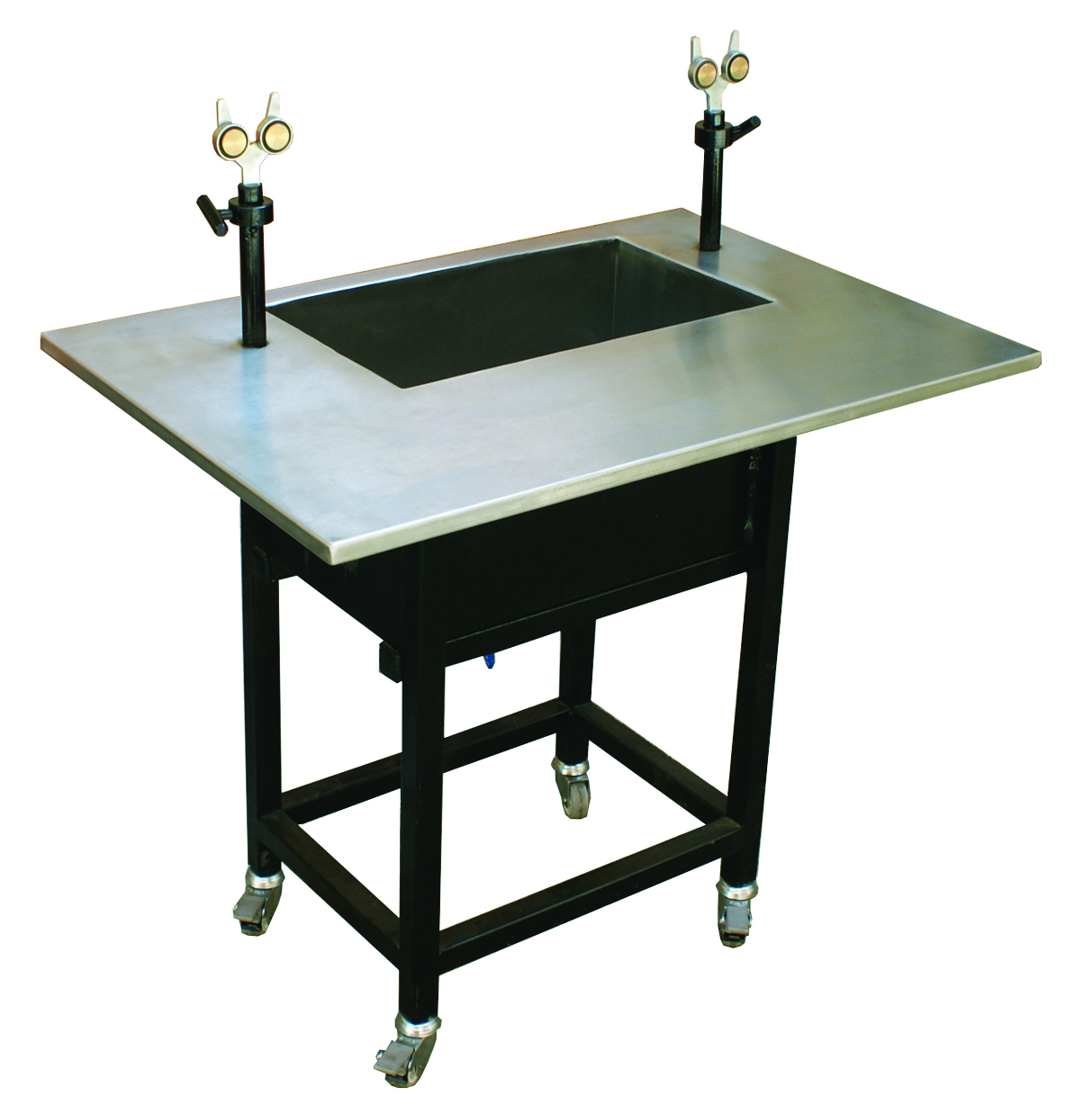 Steel construction, Stainless steel work table, Two stations for two operetor, Water tank to cool the wooden block during shaping. Tap at bottom to evacuate water and clean the tank, Height adjustable yokes at top to support blowing pipe, Lockable castor rollers to move the unit. Dimensions: 500 x 750 x 990 mm(h)