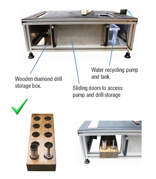 Alüminyum gövde, Paslanmaz çelik kapaklar, Kauçuk kaplı yüzey, Sorunsuz delme işlemi. Önde motor ve pompa kontrol anahtarları. Suyu toplamak ve su deposuna drenaj yapmak için paslanmaz çelik tepsi. Derinlik sınırı için durdurma halkası. Her türlü elmaslı karot matkabı R1/2″ ile kullanılabilir.